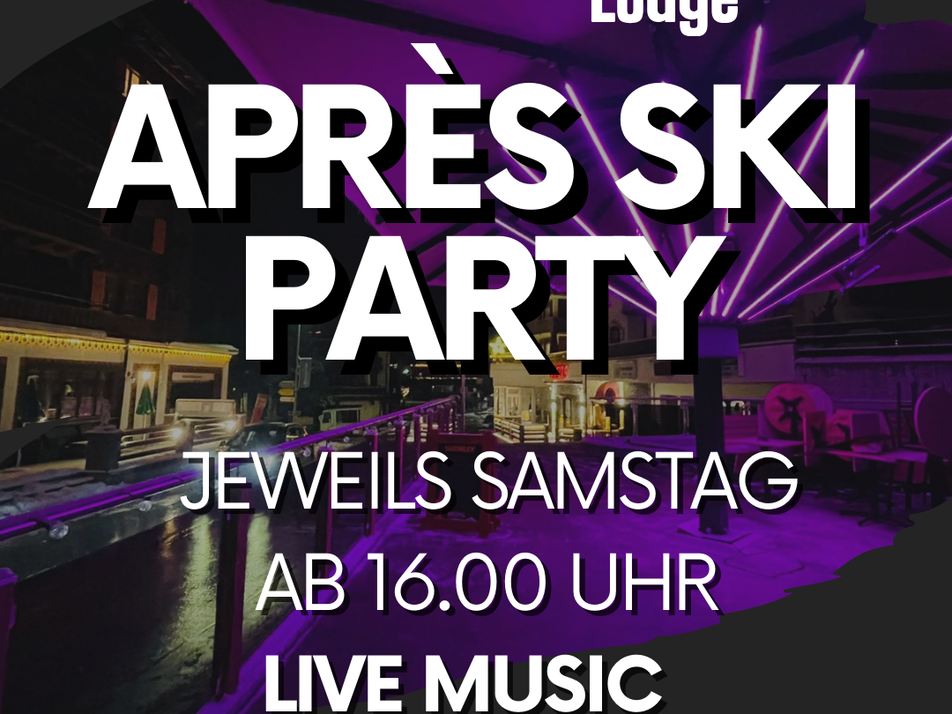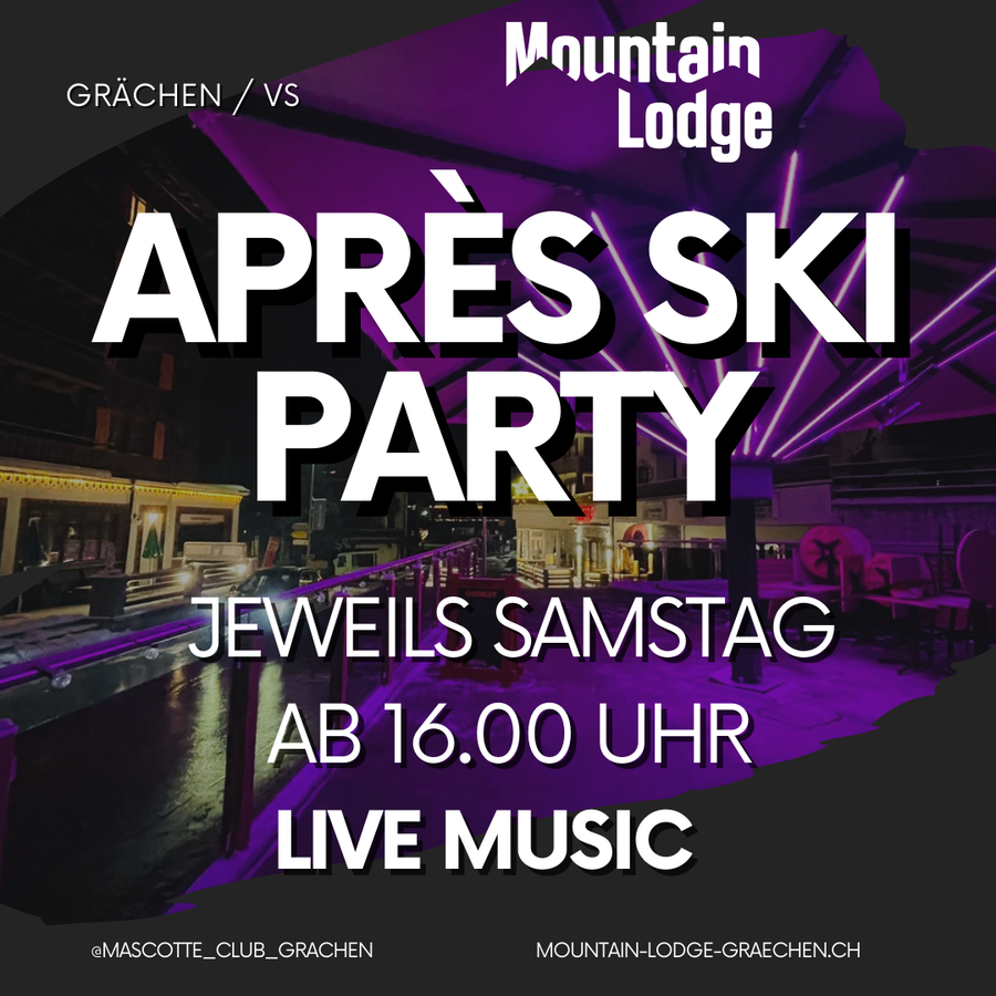 Jeden Samstag bis Ende März startet in der Mountain Lodge in Grächen ab 16.00 Uhr die grosse Après-Ski-Sause. Zwei Stunden lang – bis 18.00 Uhr – gibt’s live Musik von coolen Künstlern, feine Drinks, Fondue und dieses typische Winter-Partyfeeling, das sofort gute Laune macht.