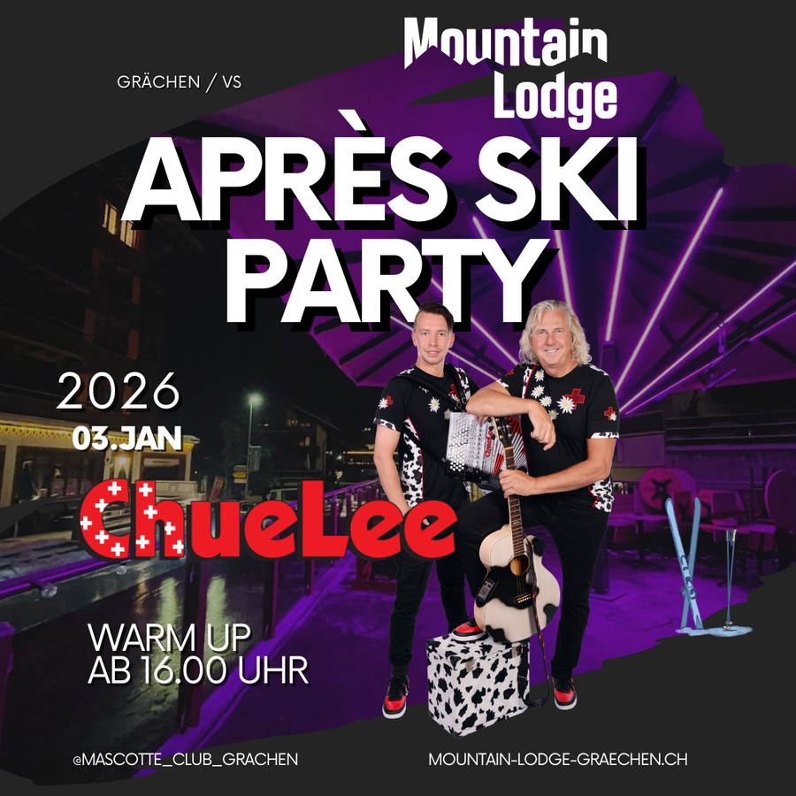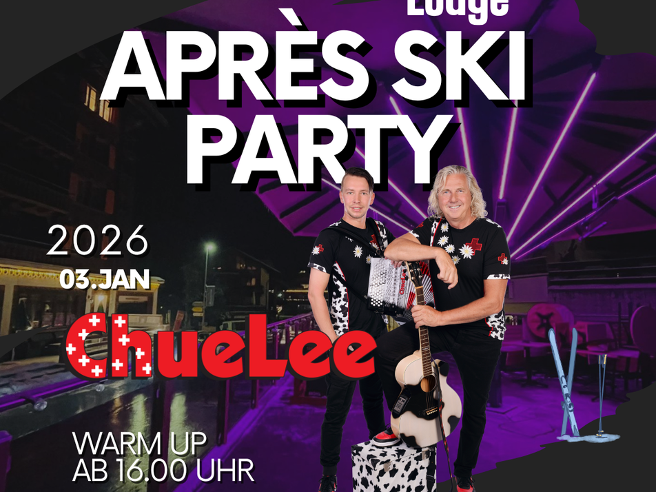Am 3. Januar 2026 sorgt ChueLee in der Mountain Lodge für das erste grosse Highlight des neuen Jahres. Mit ihrer energiegeladenen Mischung aus Party-Sound, Volksrock und guter Laune starten sie eine richtig heisse Warm-up-Party am Nachmittag. Die perfekte Gelegenheit, um nach den Feiertagen wieder in Schwung zu kommen und gemeinsam in den Januar zu feiern.