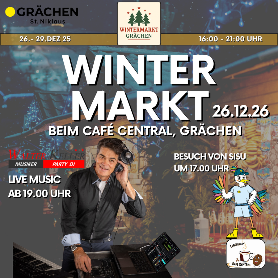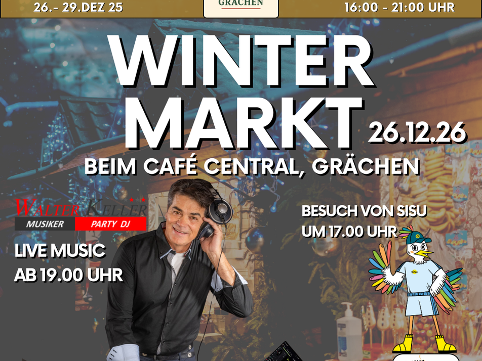 Am 26. Dezember eröffnen wir den Winter Markt in Grächen und tauchen den Platz beim Café Central in ein festliches Winterambiente. Lichterglanz, Glühweinduft und gemütliche Markthäuschen bilden den Rahmen für einen stimmungsvollen Start in die Markttage.