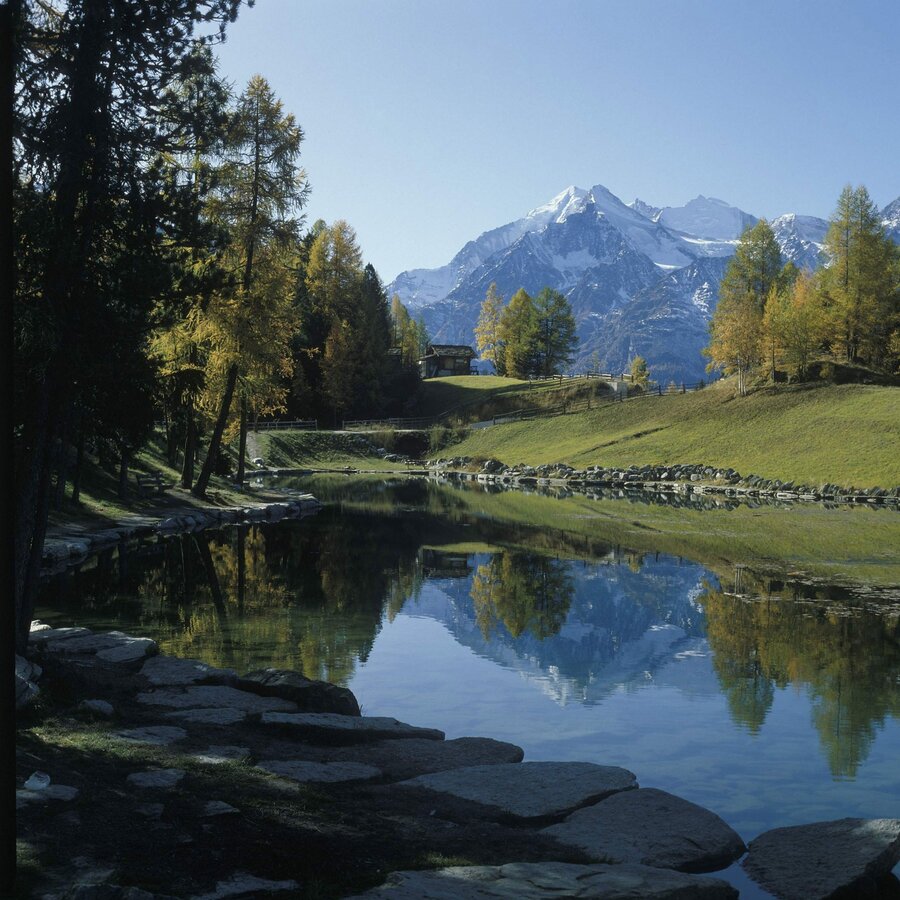 Diese Route führt euch vom Dorfplatz ansteigend nach dem Sportzentrum links den Waldweg steil hinauf zum See. Durchatmen am malerischen Bergsee und dann wandert ihr durch den erfrischenden Lärchenwald der Wegführung folgend stetig hinauf zur Hannigalp.