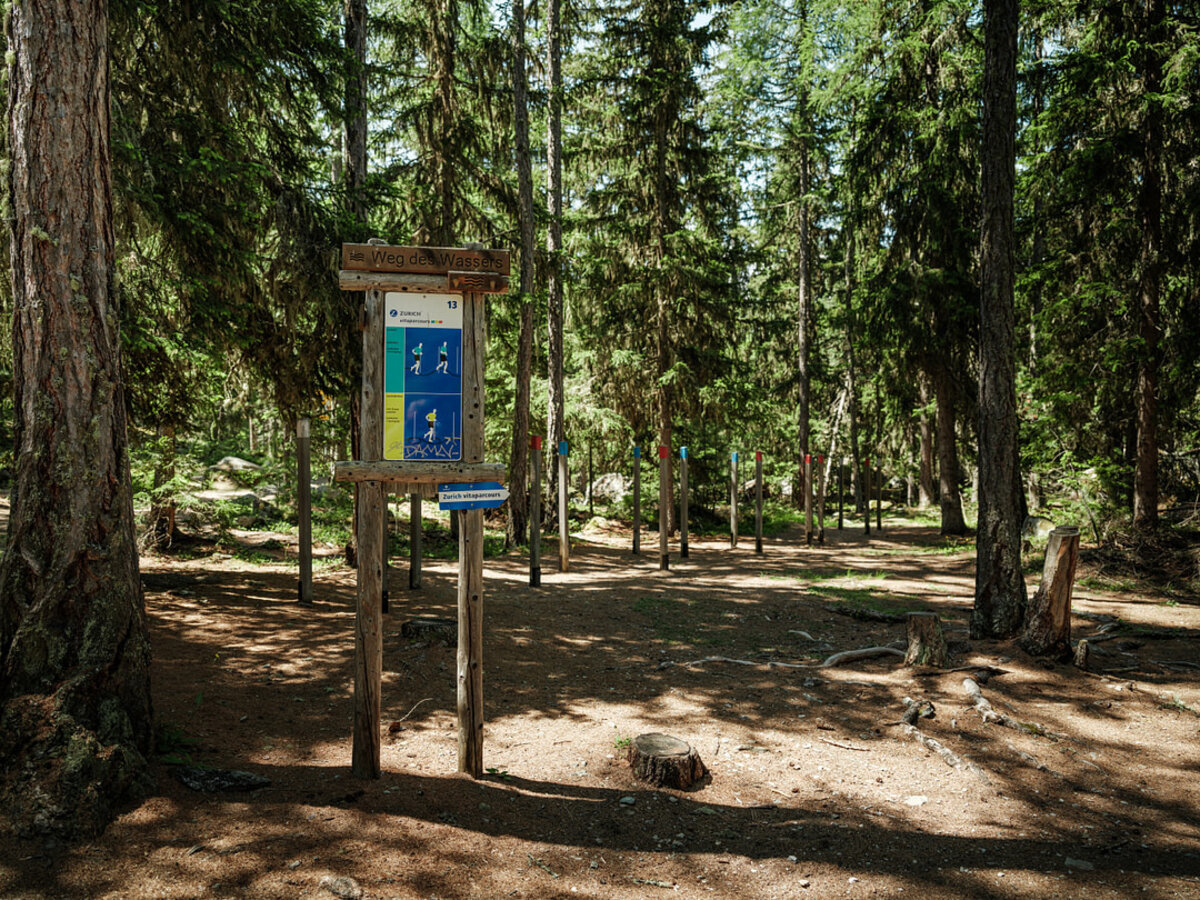 Auf eurem Weg durch den schattenspenden Lärchenwald pumpt ihr euren Körper voll mit Sauerstoff und beansprucht eure Muskeln bei zahlreichen sportlichen Aktivitäten, die sich entlang des 5 km langen Parcours bieten. Die abwechslungsreiche Strecke mit leichten up und down`s führt an den erfrischenden Suonen entlang zum naturbelassenen Bergsee.