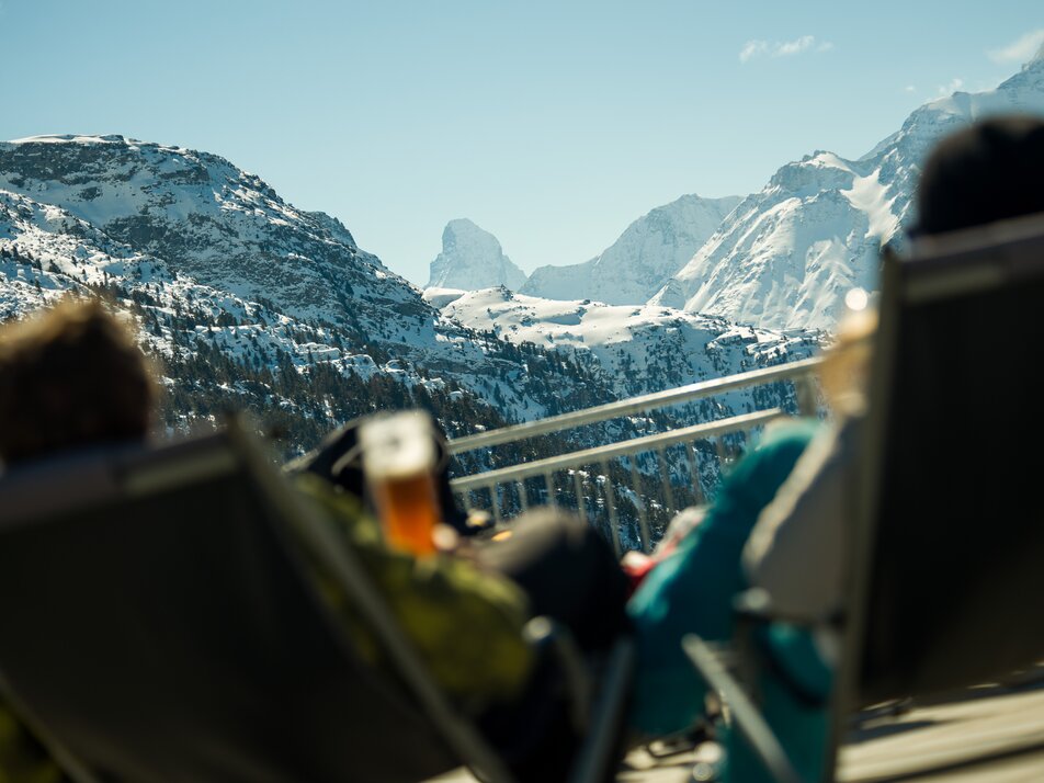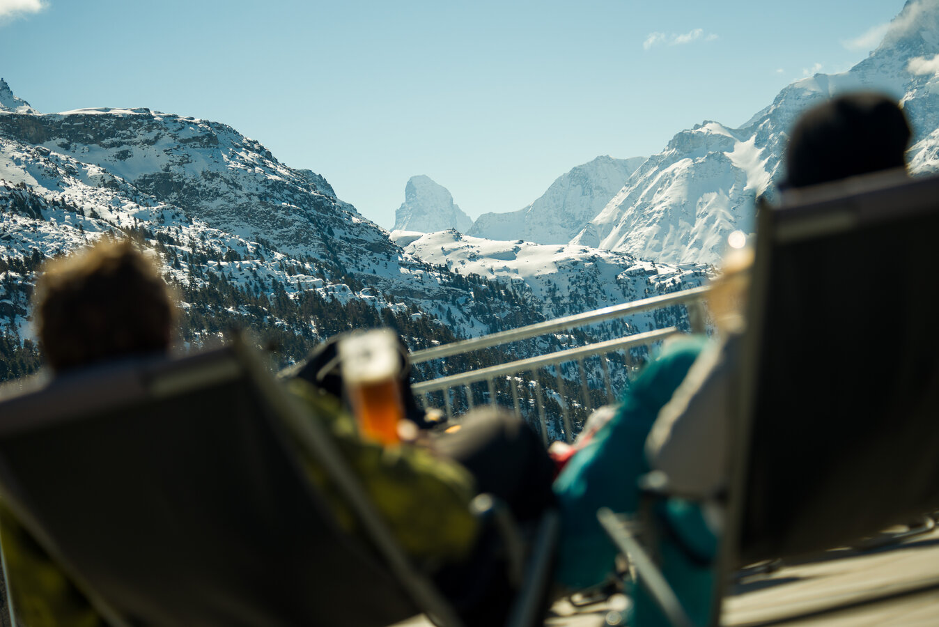 Besonders empfehlenswert für alle, die eher relaxen möchten: Die Sonnenterrasse mit den zahlreichen Liegestühlen ermöglicht euch einen phänomenalen Blick auf das umliegende Gipfelpanorama.