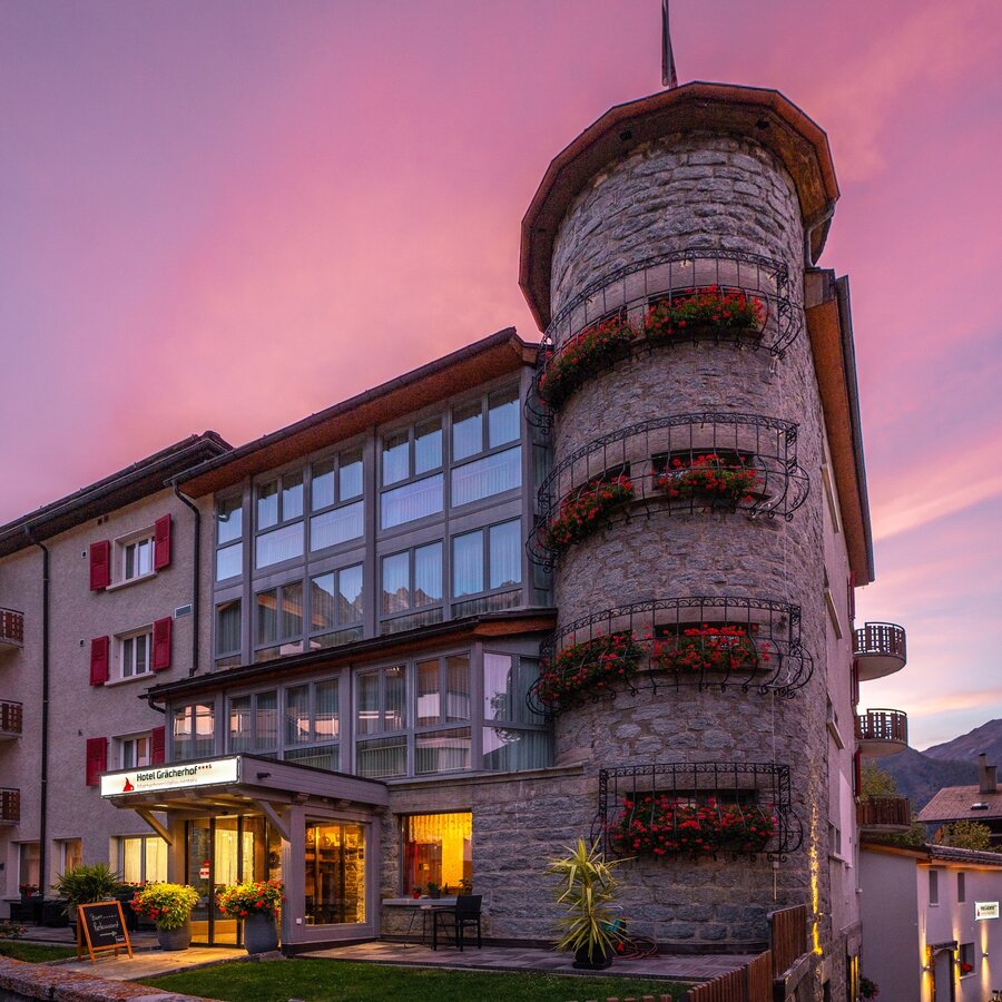 Vor beeindruckender Kulisse im autofreien Dorfteil, verfügt das Hotel dennoch über eine direkte Zufahrtsstrasse sowie hoteleigene Parkplätze.