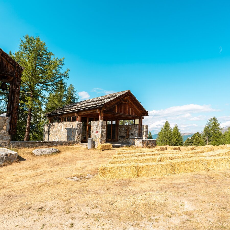 Die markante Kapelle wirkt eher modern und ist im Innern einfach ausgestattet. Anders als die typischen Walliser Kapellen besticht sie durch ihre Bauweise und dem Materialmix aus Glas, Holz und Stein. Hier versammelt man sich gerne für Trauungen, Taufen und Gottesdienste – ein Ort, der besondere Momente wachsen lässt. Oberhalb der Hannigalp gut zu Fuss erreichbar, belohnt euch ein spektakulärer Ausblick auf die umliegende Bergkulisse.
